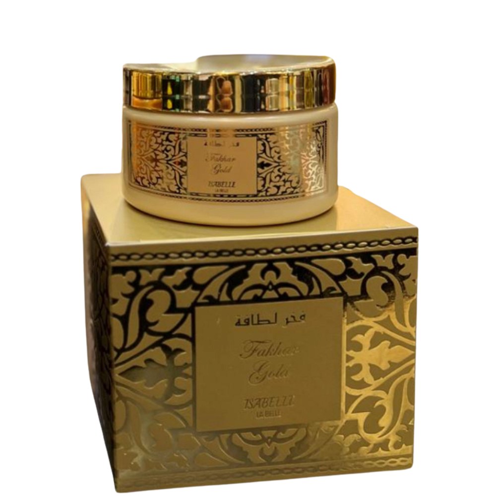 Quer sentir um hidratante que é puro luxo árabe com um toque doce, quente e extremamente envolvente? O Hidratante Fakhar Gold – Isabelle La Belle (200g) é intenso, cremoso e marcante — perfeito pra quem quer uma pele perfumada com presença 🍯🔥