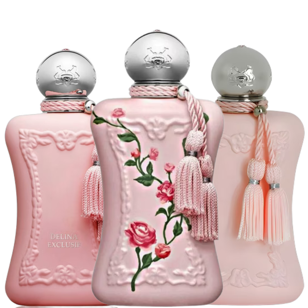 Esse kit reúne três versões icônicas da linha Delina, da Parfums de Marly, todas com sua identidade olfativa especial: