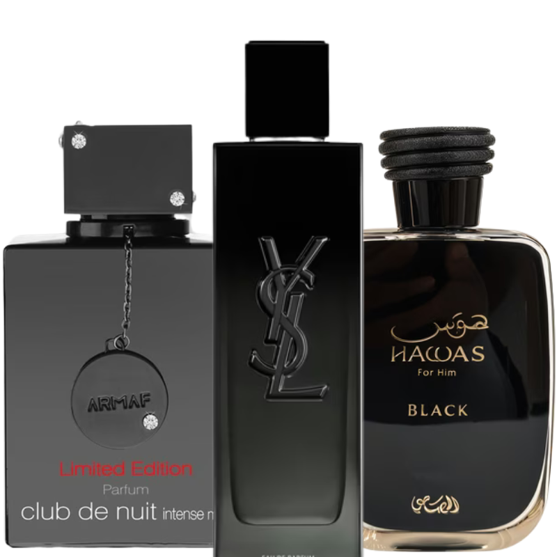 Descubra o equilíbrio perfeito entre sofisticação e intensidade com o Kit Power Blend Masculino, que reúne 3 decants de 5ml dos perfumes YSL Myslf, Rasasi Hawas for Him Black e Armaf Club de Nuit Parfum.